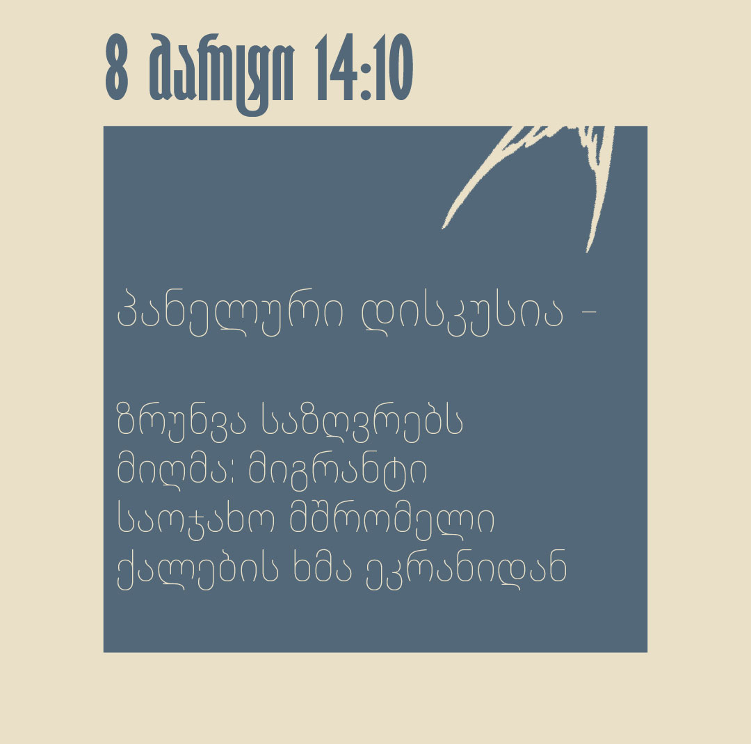 ფესტივალის მესამე დღეს, ქალთა საერთაშორისო დღის აღსანიშნავად, ფოკუსს საოჯახო და ზრუნვის შრომით მიგრაციაზე გადავიტანთ. საღამო დაიხურება დისკუსიით, რომელსაც მოდერირებას გაუწევს საოჯახო და ზრუნვის მშრომელების პროფკავშირი.